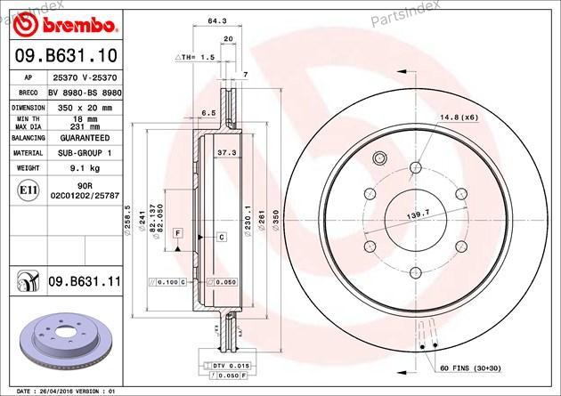 09.B631.11 BREMBO Диск тормозной задн. с УФ покрытием INFINITI QX56 01/10-> / INFINITI QX80 09/13-> / NISSAN PATROL VI