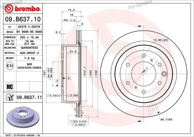 09.B637.11 BREMBO Диск тормозной задн. с УФ покрытием MITSUBISHI PAJERO IV (V8_W V9_W) 11/06-> / MITSUBISHI PAJERO IV