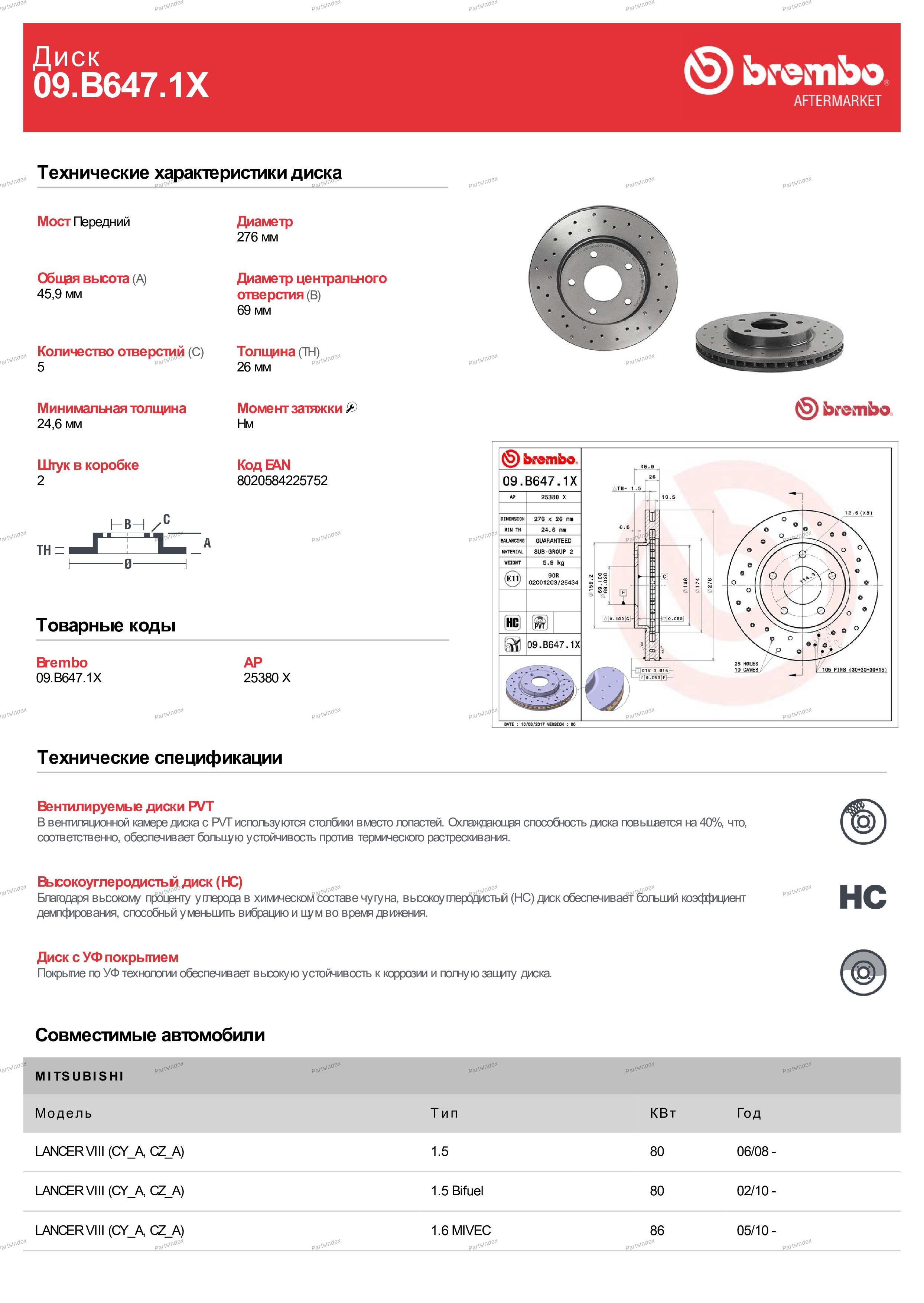 | Наименование | Диск тормозной передн. серии Brembo Xtra MITSUBISHI LANCER VIII (CY_A CZ_A) 03/07-> / MITSUBISHI LA |