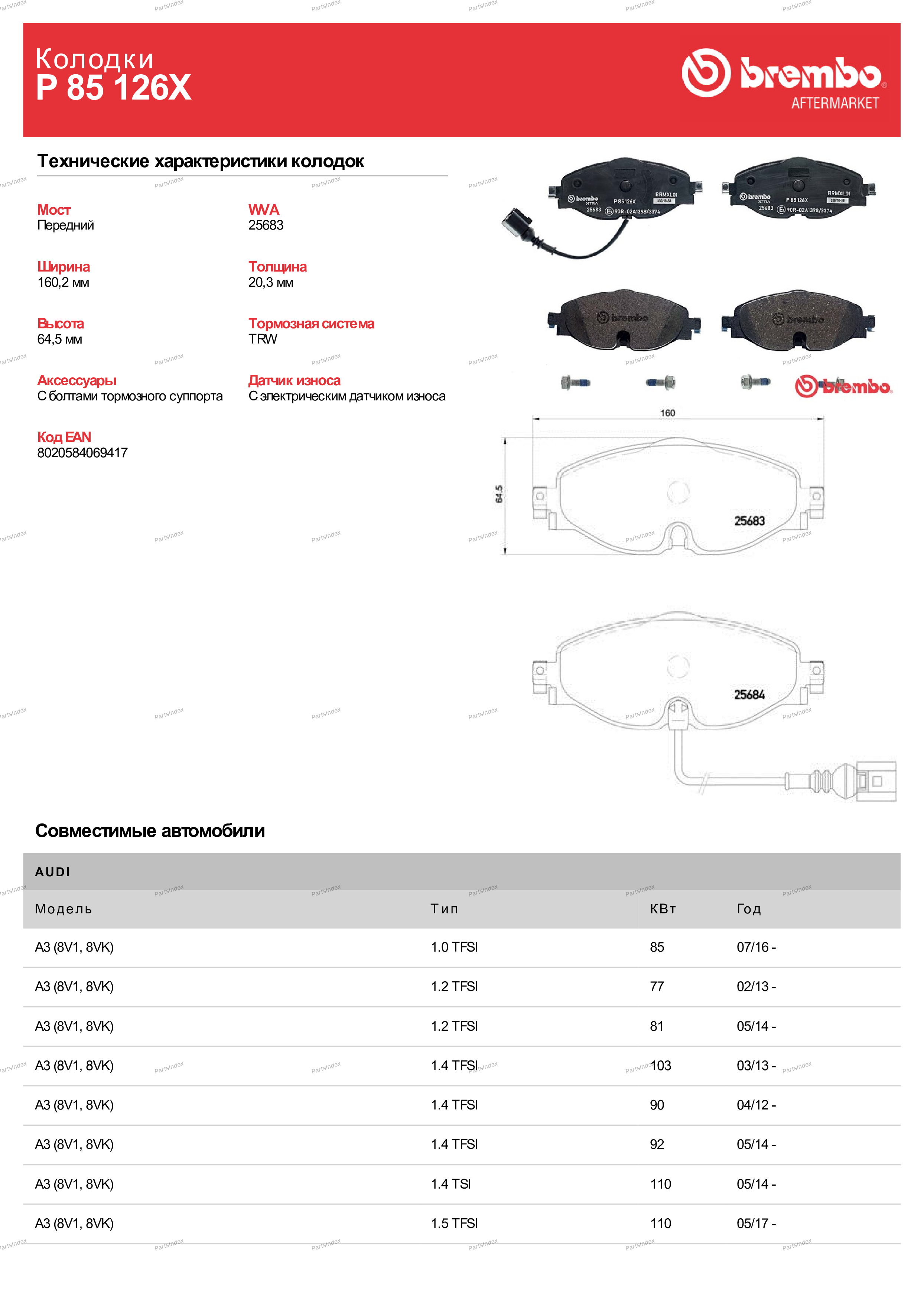 P85126X BREMBO Колодки тормозные дисковые передн. серии Brembo Xtra AUDI A3 (8V1 8VK) 04/12-> / AUDI A3 Convertibl